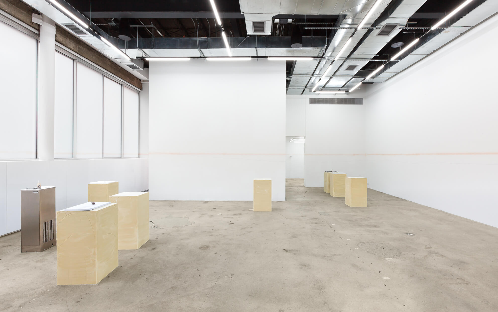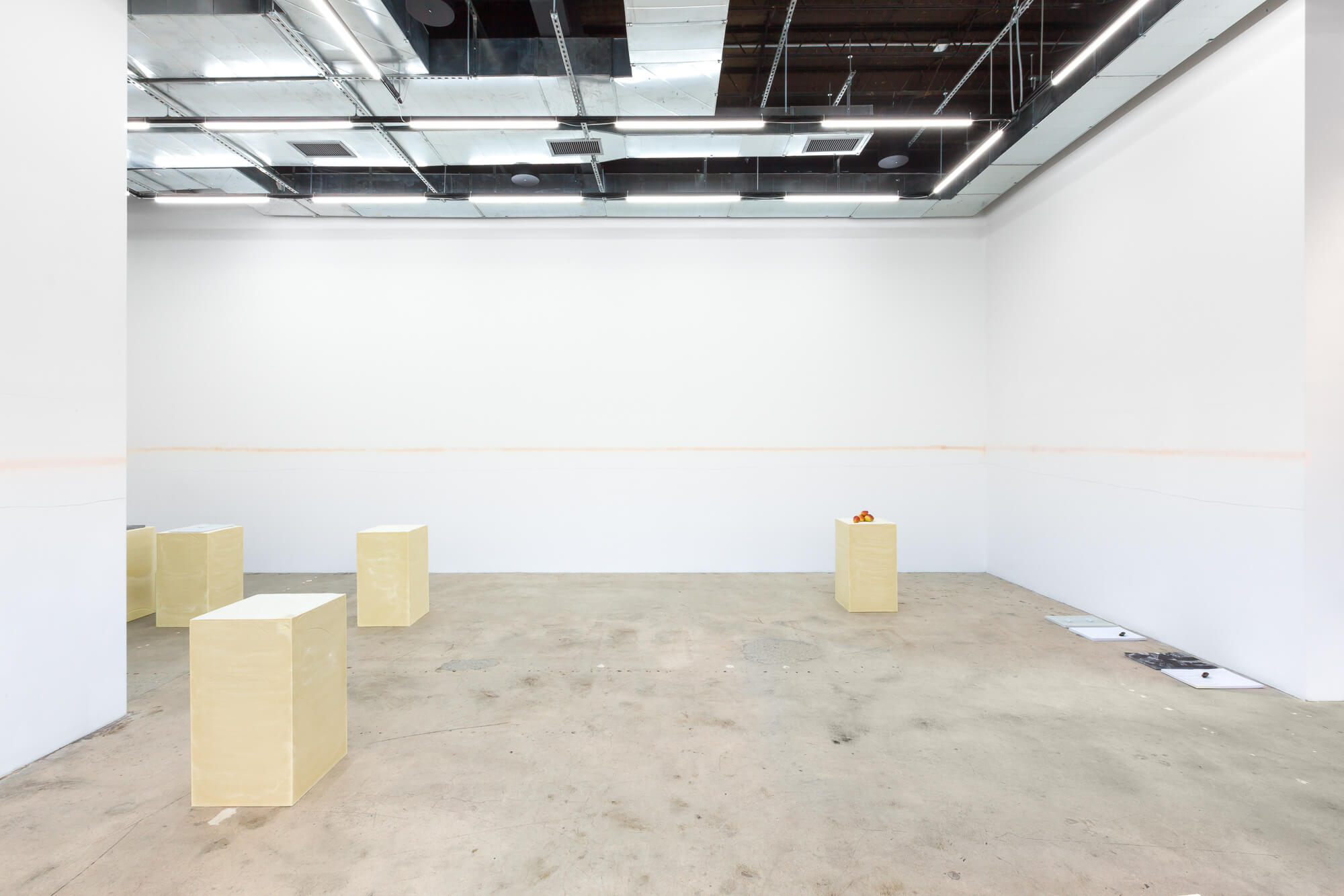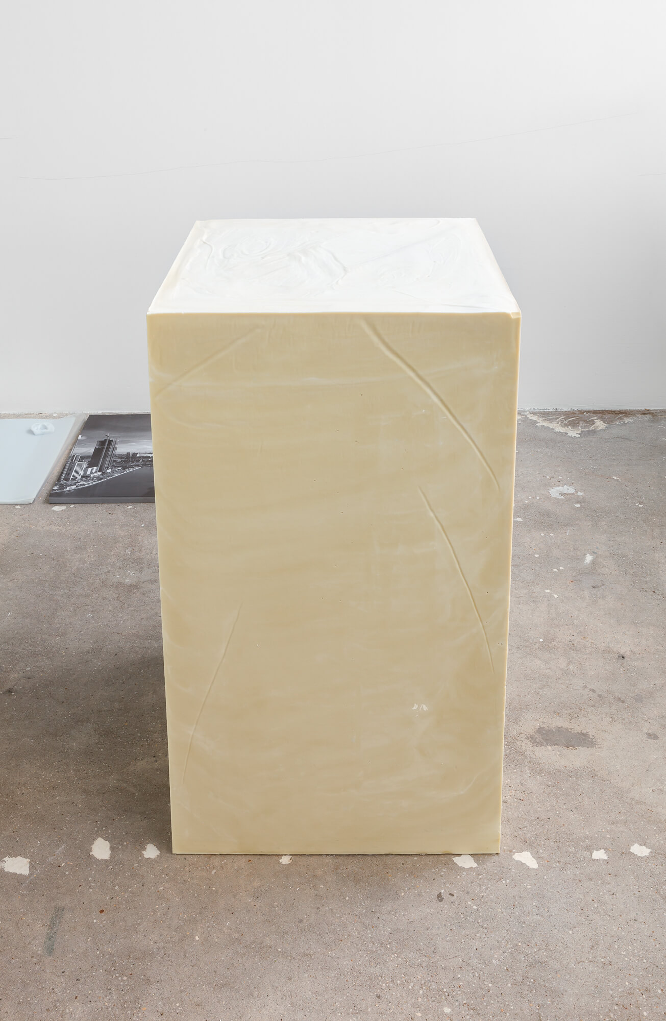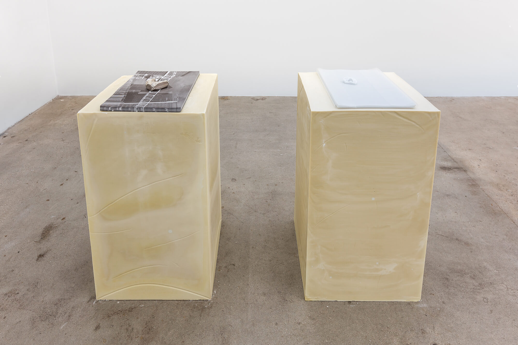 SWEAT SHAME ETC. places emphasis on a supporting architecture by foregrounding the role of the exhibition plinth. The plinths here are constructed from recently poured olive oil soap that will undergo a curing process throughout the duration of the exhibition.Â