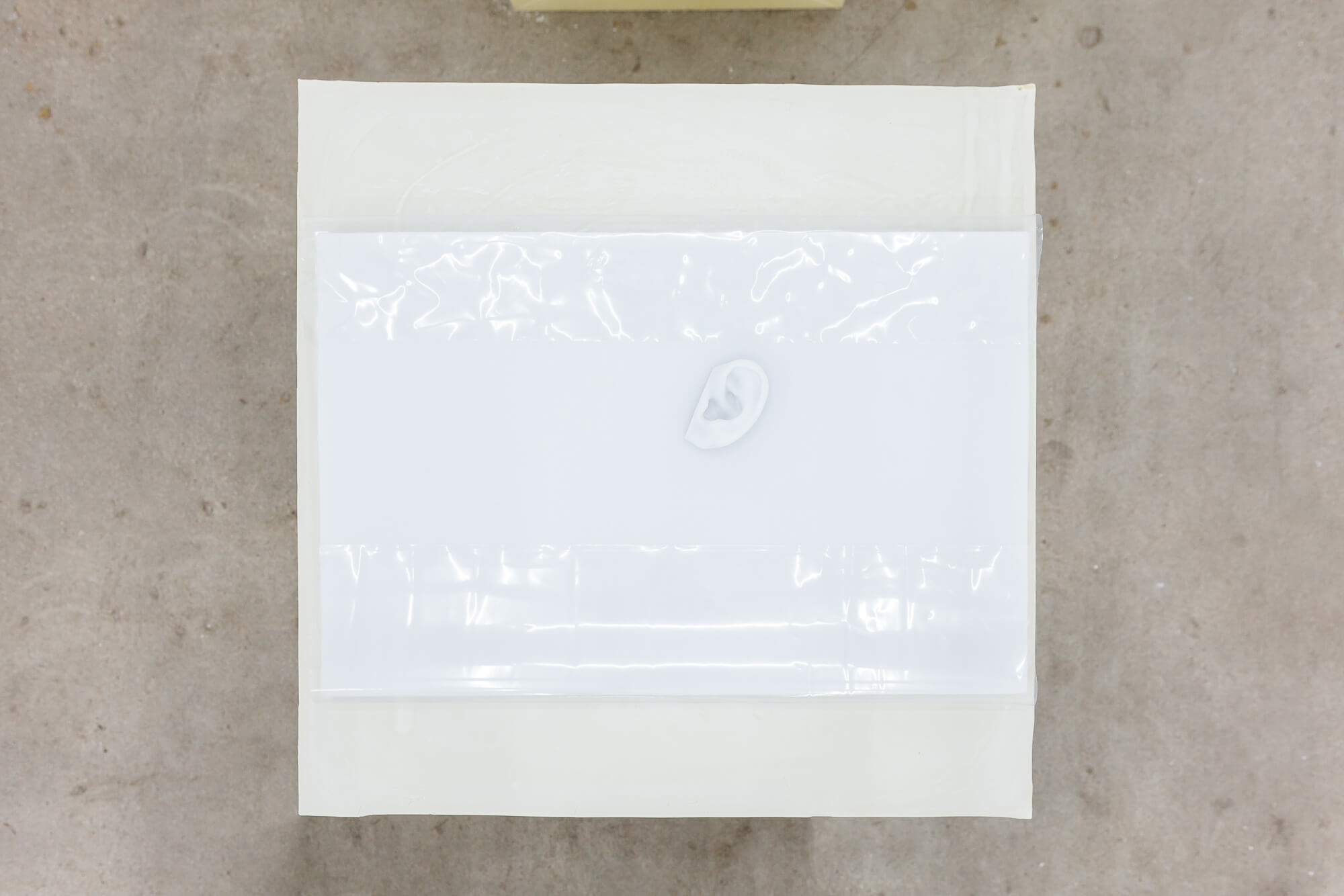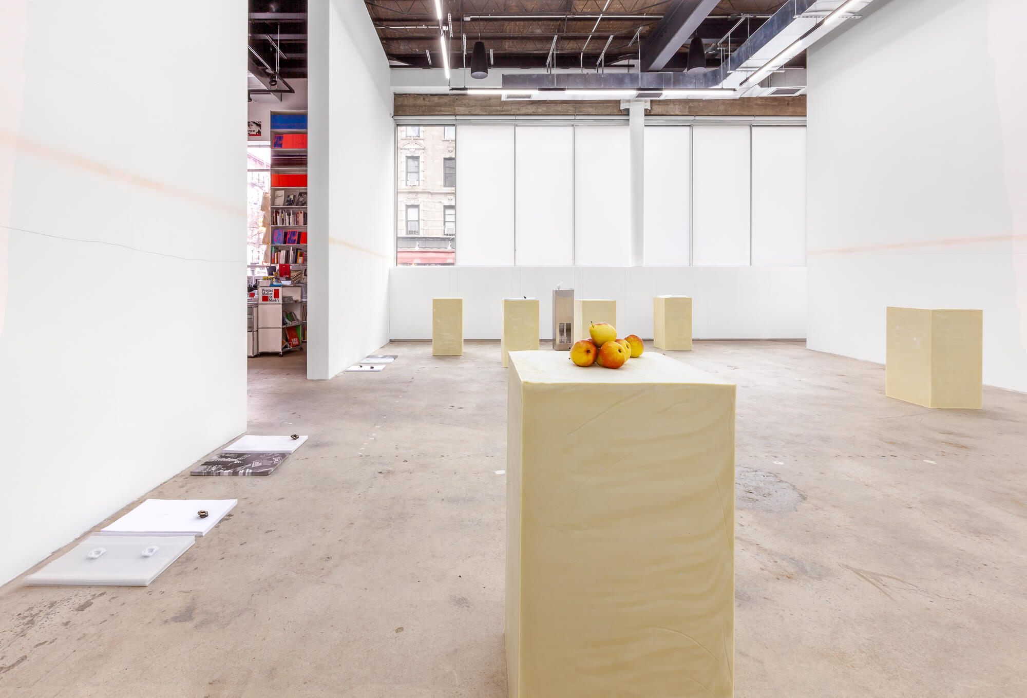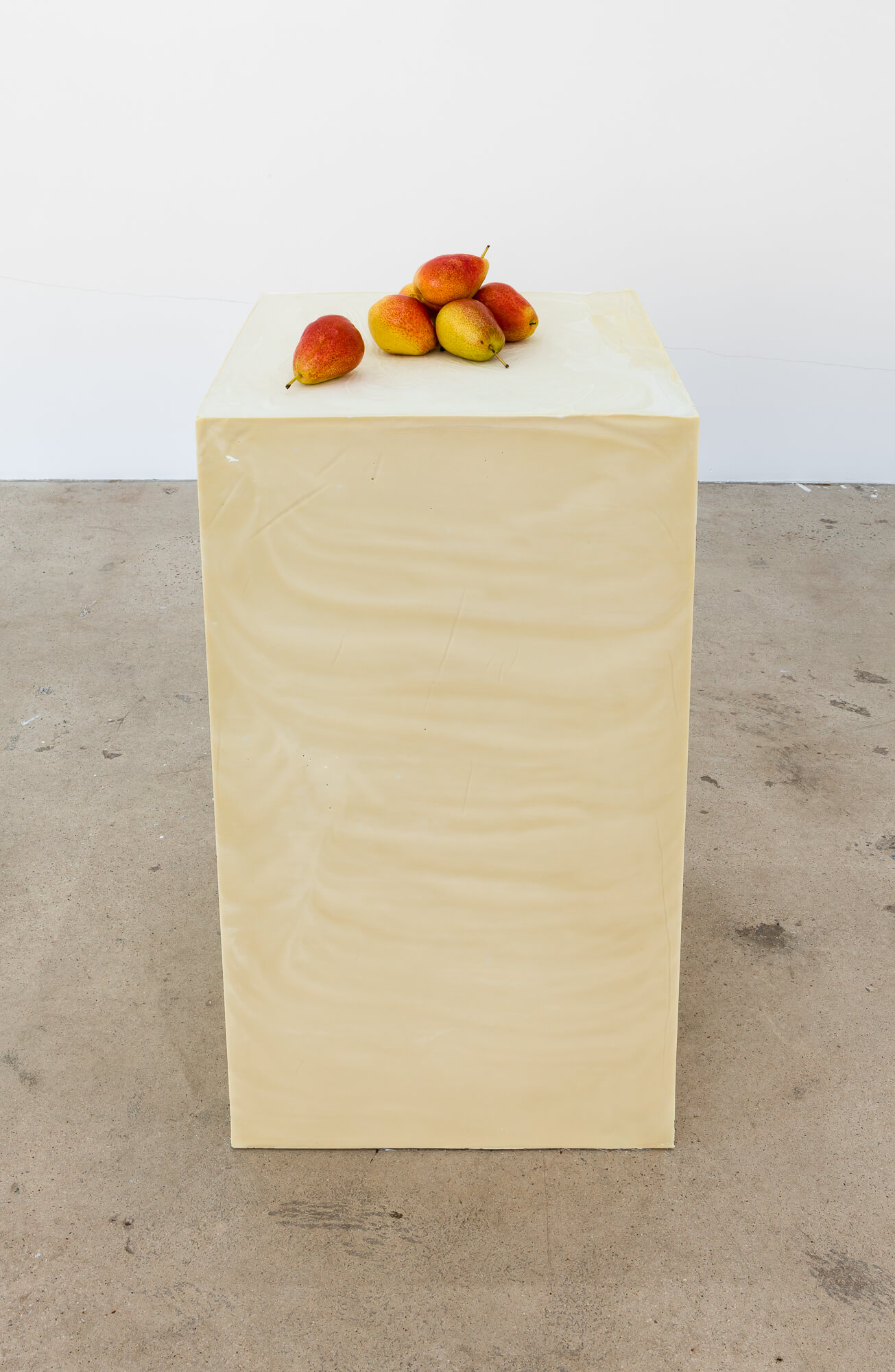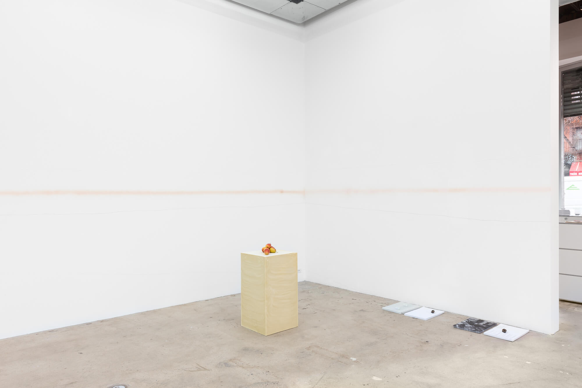 SWEAT SHAME ETC. places emphasis on a supporting architecture by foregrounding the role of the exhibition plinth. The plinths here are constructed from recently poured olive oil soap that will undergo a curing process throughout the duration of the exhibition.Â