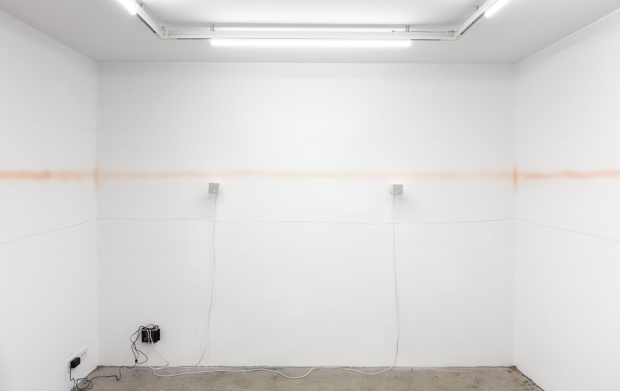 The backdrop to this scene is a large-scale wall drawing (Self Tracking, 2018), depicting five years of extracted data. An average line is marked in a continuous streak of spray tan, staining the perimeter of SI's ground floor with a corporeal tidemark. Plotted around it are the fluctuations of the artist's thyroid TSH levels, her artfacts.net ranking, and the value of the British Pound against the Euro.