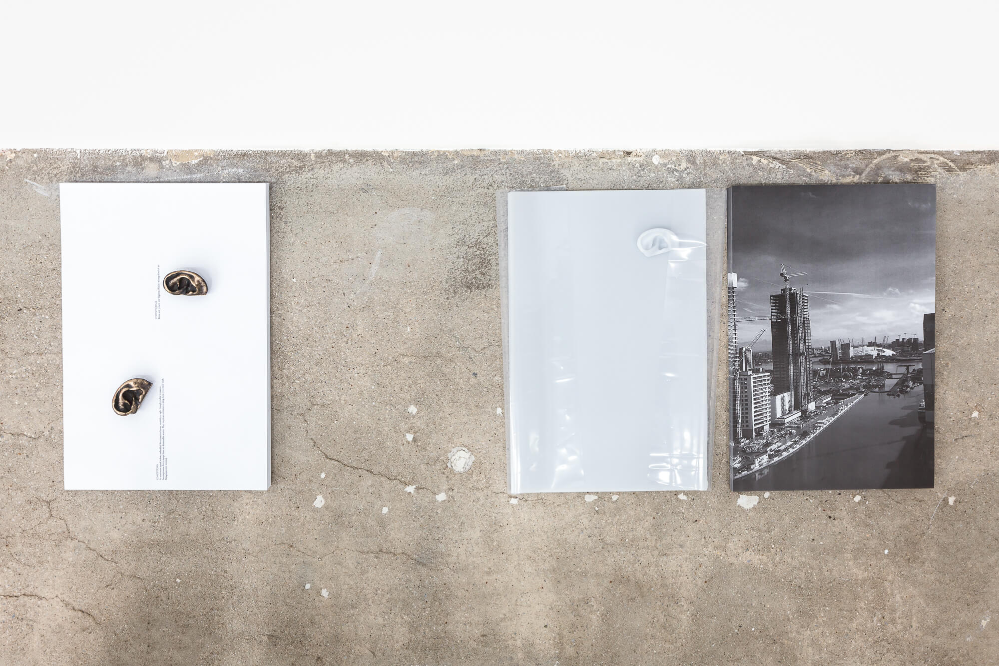 Each plinth has the same approximate weight as the artist’s body and forms an organic, partially unstable and imperfect display device that is vulnerable to shrinkage, decay and age spots. Hosted on top of the plinths are a number of Spooner’s sculptures (2017–18), including offset prints, 3D prints and cast metal objects. In close proximity is a stainless-steel drinking fountain with its faucet jammed, so that it is perpetually running (Murderous Public Drinking Fountain, 2018). Disconnected from any public water source, the fountain is fed from its own supply of chlorinated water, continuously cycling a hygienic yet poisonous agent through itself.