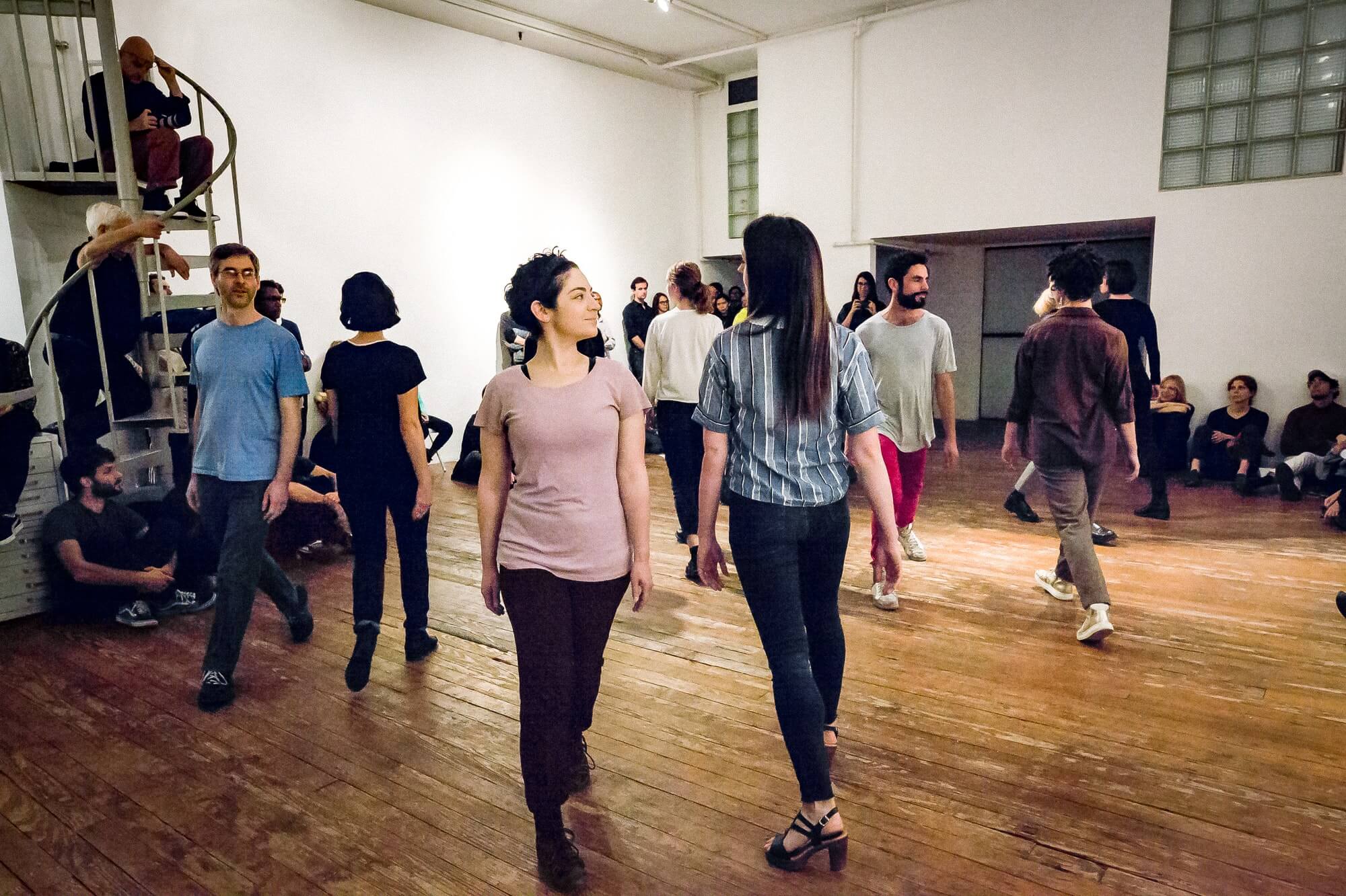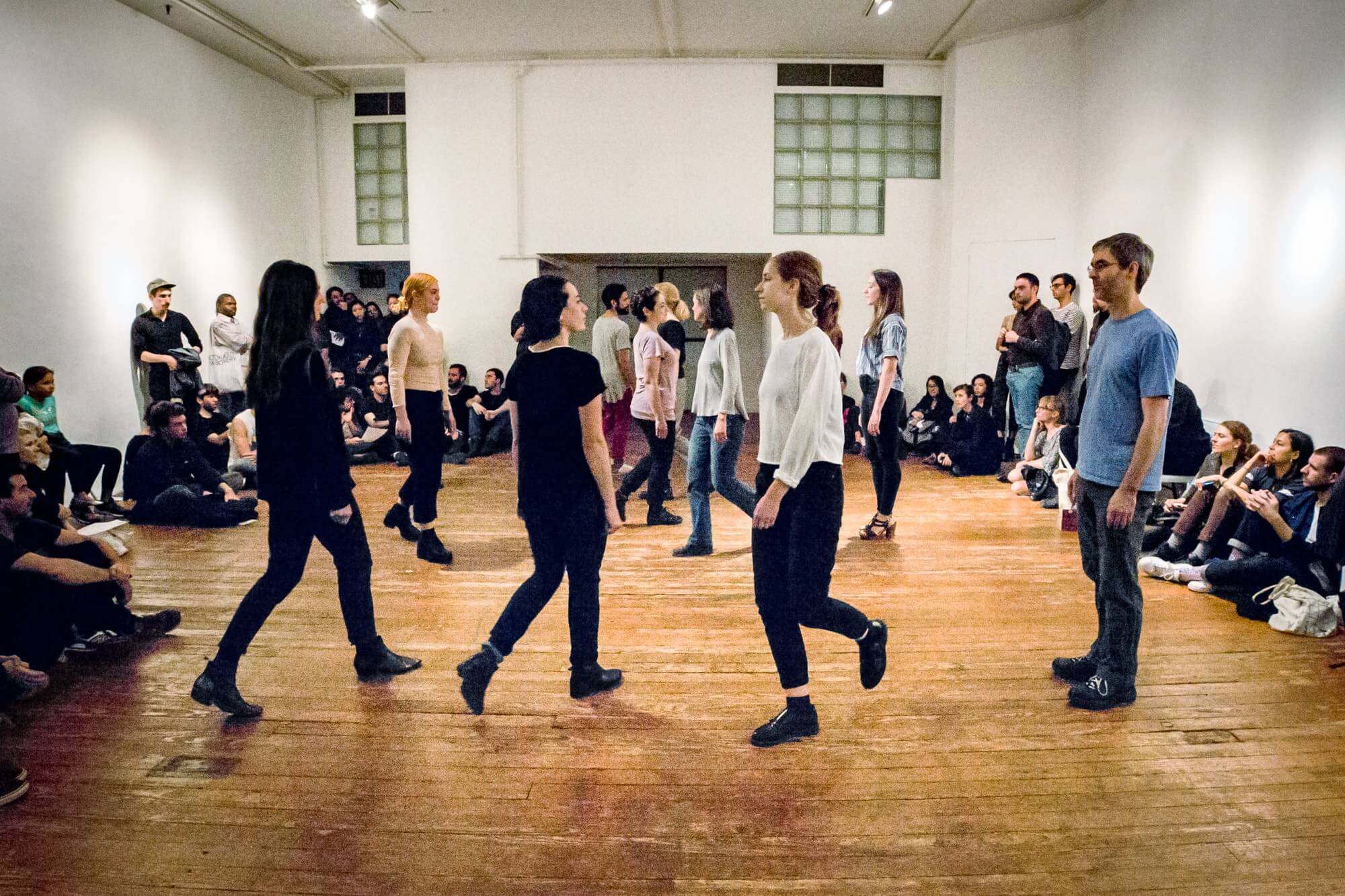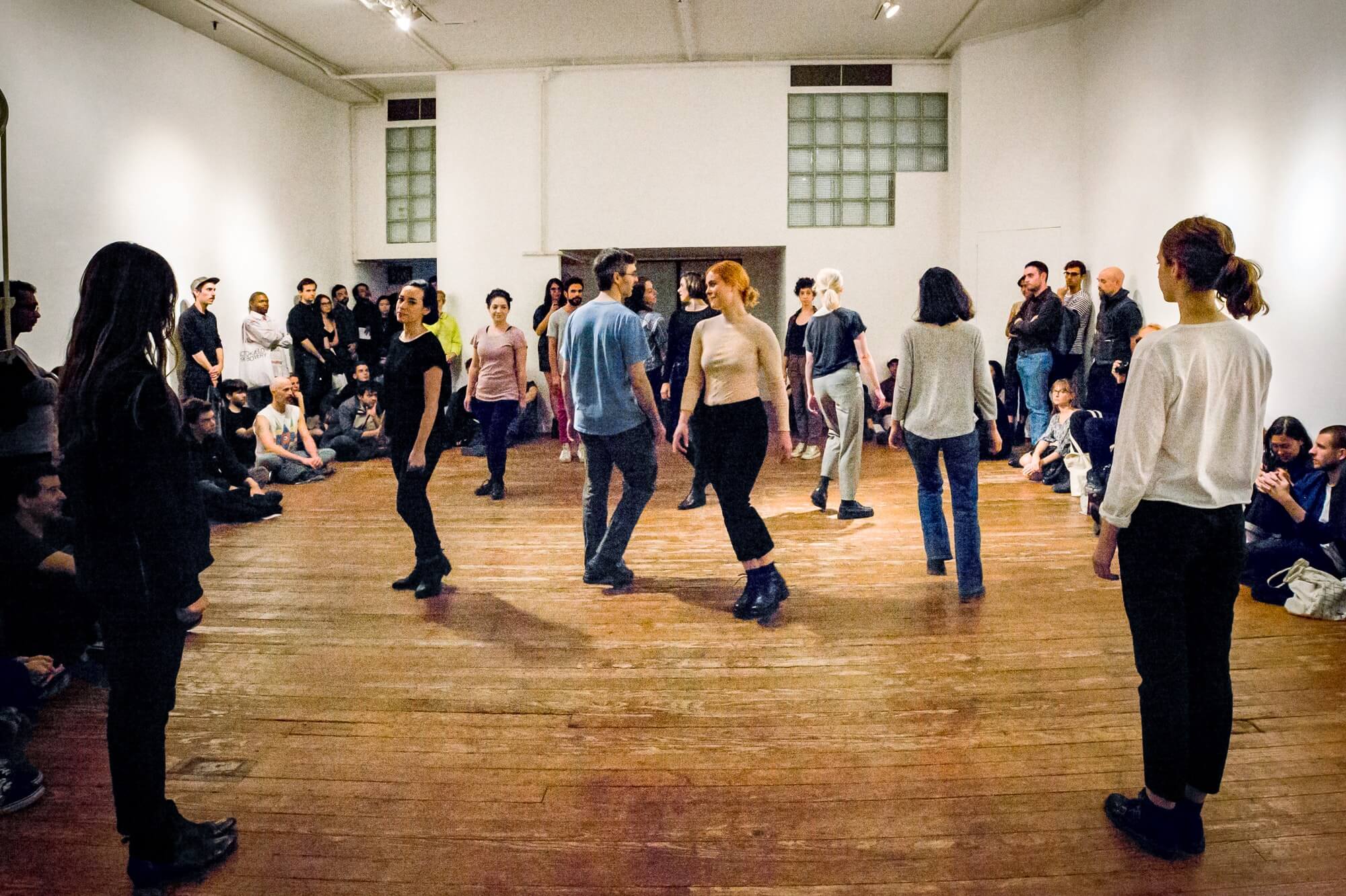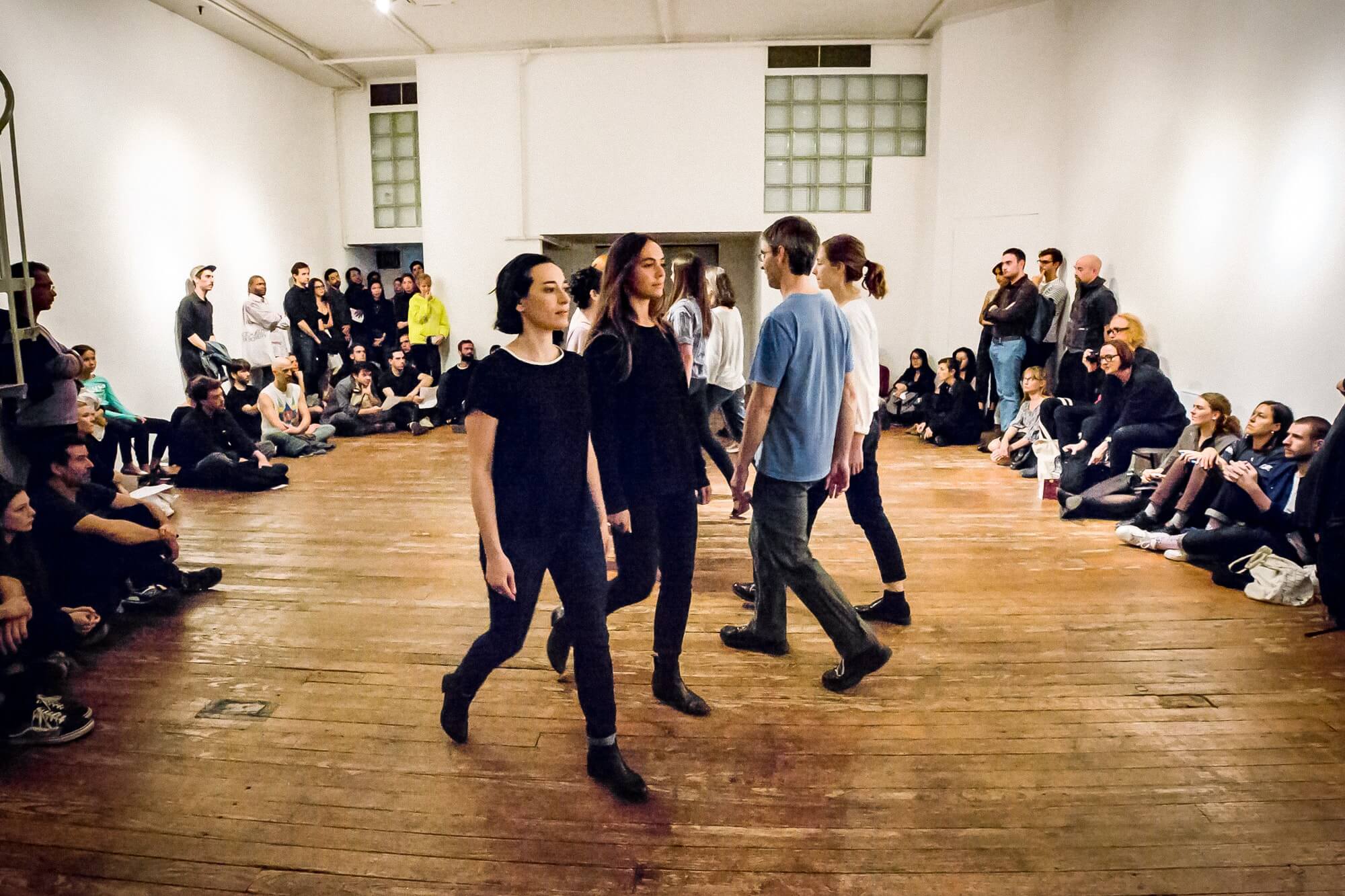 Contradance draws on the framework of contra dance traditions that organize a social dance using the form of A-B pairs. In a stripped back form, the mechanics of the choreographic operations are accentuated, as the dancers weave amongst one another, describing the architecture through sequences of movement. Each with varying degrees of formal training, dancers change partners and neighbors after each repetition which guides them through space.
